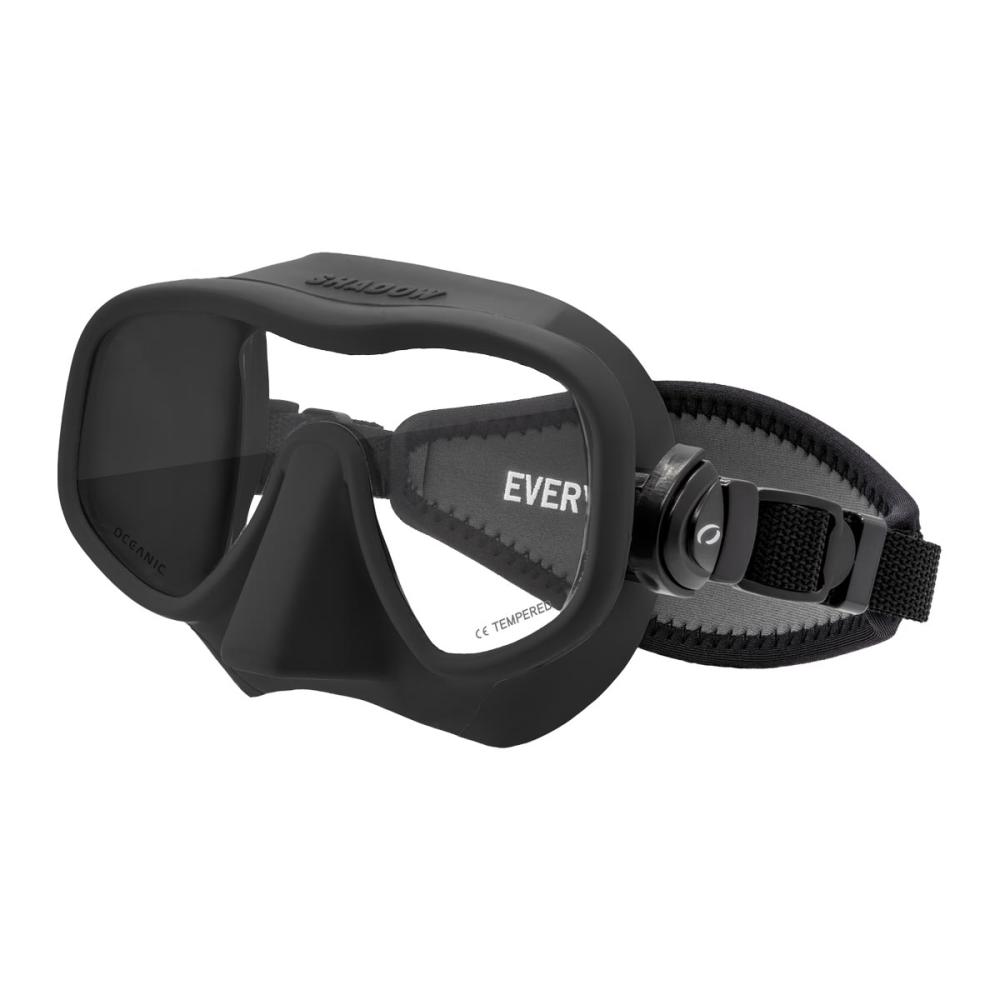 The Oceanic Shadow mask is a very lightweight and compact frameless design mask with a single lens that is molded directly into the soft silicone skirt to help reduce the weight and internal volume of the mask. The removal of the frame also allows the mask to be folded almost flat which makes it an ideal backup mask as well as a superb primary mask. The combinations of lens position relative to the eye and the shape provides an incredible field of vision. The mask is fitted with a webbing and neoprene strap instead of a silicone strap for improved comfort and adjustment. The skirt is made from soft and comfortable silicone that is finished with a matt surface on the outside but a gloss surface on the inside that offers a better seal against the skin.